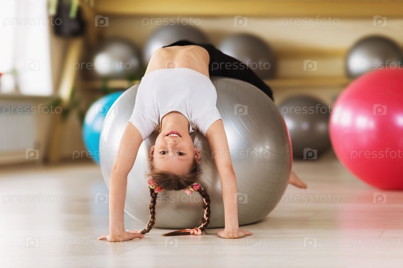 Маленькая девочка в спортивной одежде делает упражнение по бриджу на фитболе в спортивной студии. Ребенок улыбается и позирует с опущенной головой, опираясь руками для равновесия