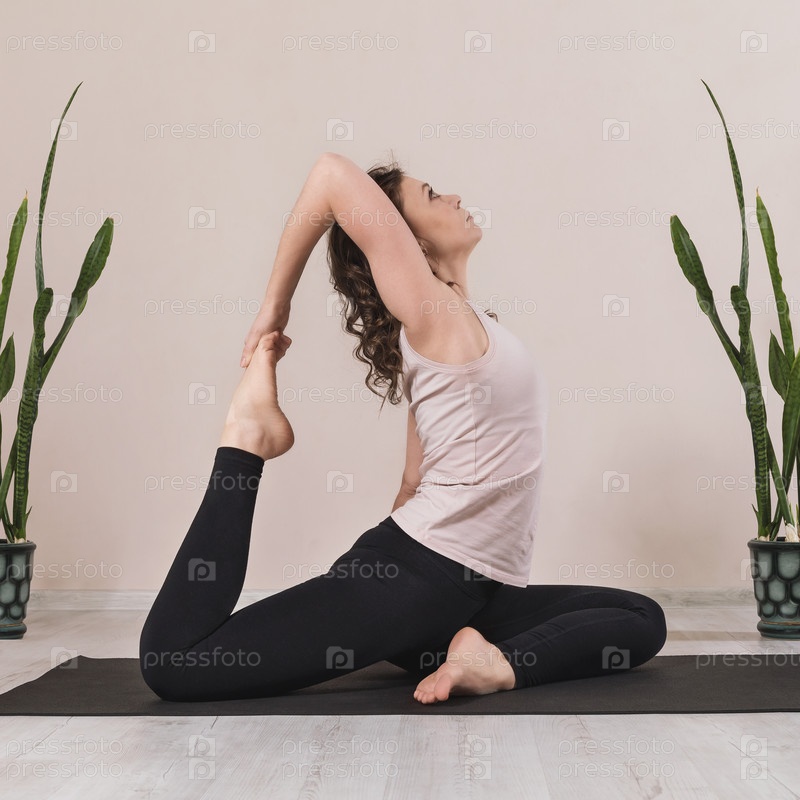 Привлекательная женщина в спортивной одежде, практикующая йогу, выполняет упражнения капотасана на коврике, поза голубя
