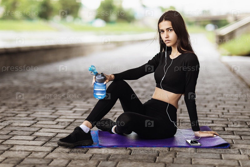 Портрет молодой женщины в черной спортивной одежде, отдыхающей после занятий спортом на улице
