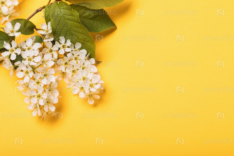 Ветка черемухи на желтом фоне с копией пространства