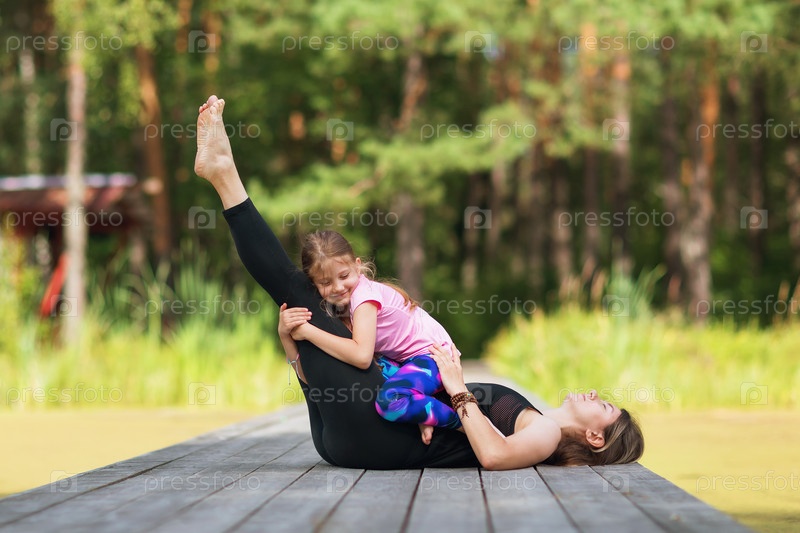 Мама и дочь отдыхают во время утренней зарядки на свежем воздухе