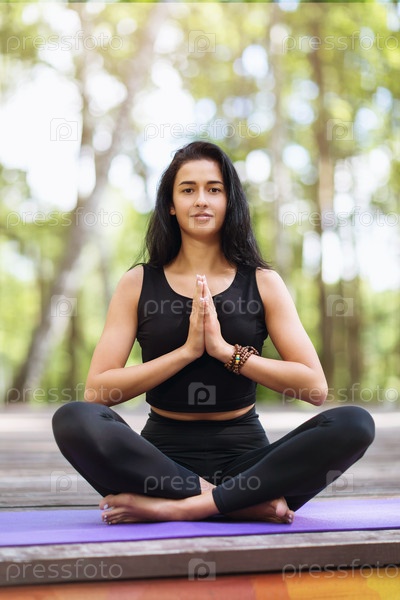 Молодая женщина в спортивной одежде, сидящая на деревянном мосту, занимается медитацией