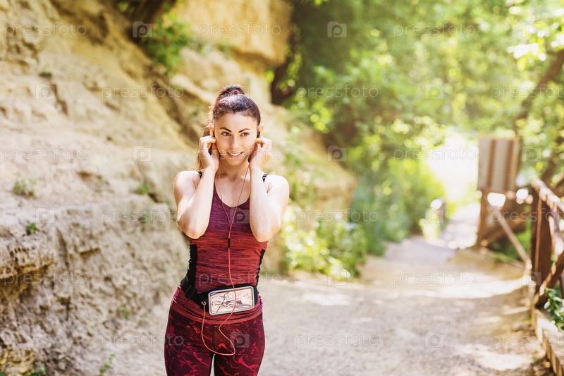 Девушка-спортсменка слушает музыку в перерыве между тренировками. Концепция на тему здорового образа жизни