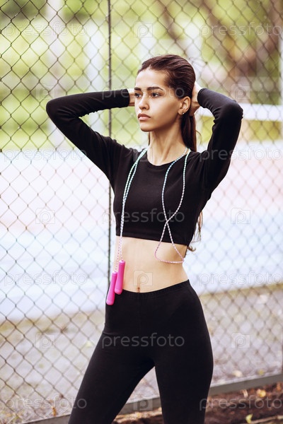 Портрет молодой красивой женщины со скакалкой в руках на фоне спортивной площадки