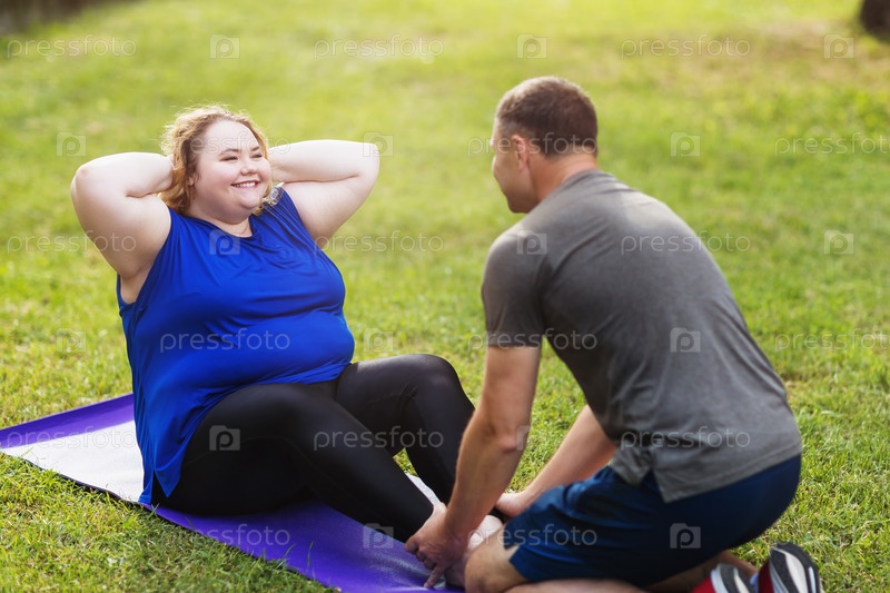 Молодая блондинка размера плюс выполняет упражнения на свежем воздухе с тренером. Концепция здорового образа жизни