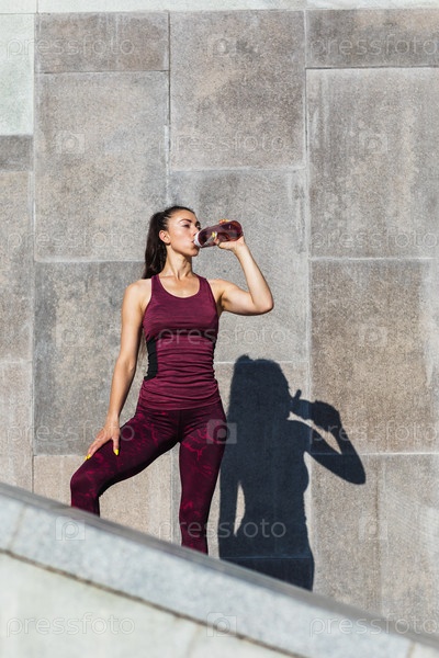 Молодая спортсменка пьет воду из бутылки на улице у стены