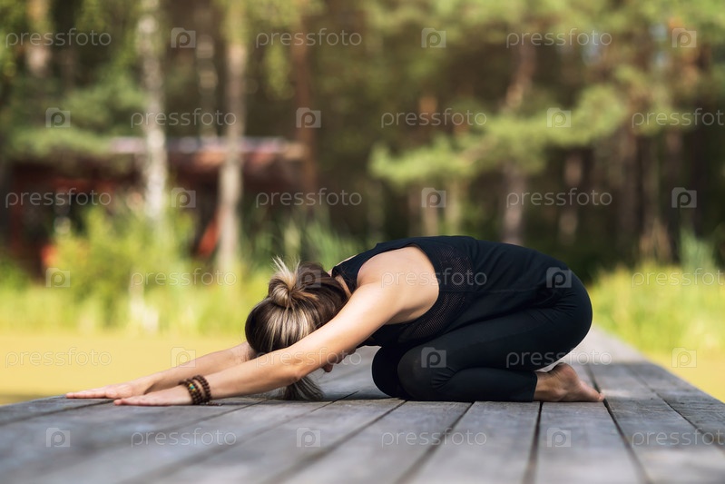 Женщина в спортивной одежде, сидящая на деревянном мосту, практикует асаны йоги, выполняя детскую позу