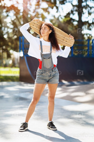 Портрет красивой молодой женщины с длинной доской в руках в парке солнечным летним утром