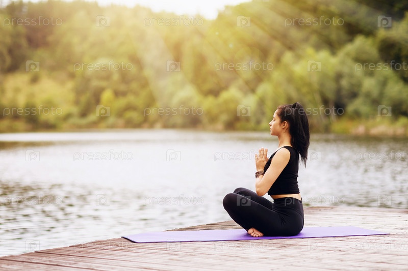 Молодая брюнетка занимается медитацией в позе лотоса на деревянном мосту у реки
