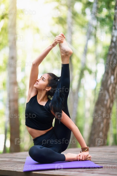 Красивая молодая брюнетка в черной спортивной одежде занимается йогой, выполняет упражнения Сурья Янтрасана, сидит в позе компаса на деревянном мосту в парке
