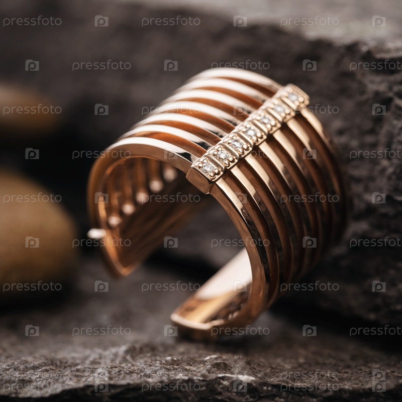 Красивое женское золотое кольцо, украшенное мелкими драгоценными камнями с разных сторон на каменной поверхности, крупным планом