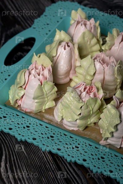 Зефирные тюльпаны. Натуральный домашний зефир. Разложил на подносе. Крупный план
