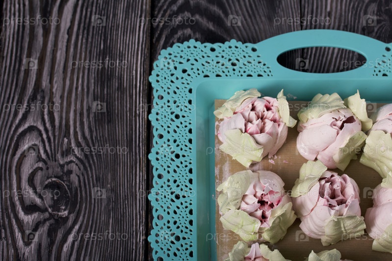 Зефирные тюльпаны. Натуральный домашний зефир. Разложил на подносе. Крупный план