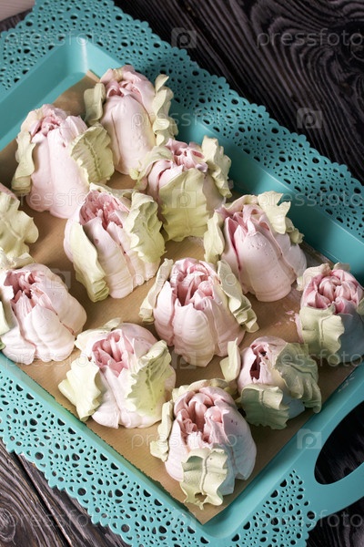 Зефирные тюльпаны. Натуральный домашний зефир. Разложил на подносе. Крупный план