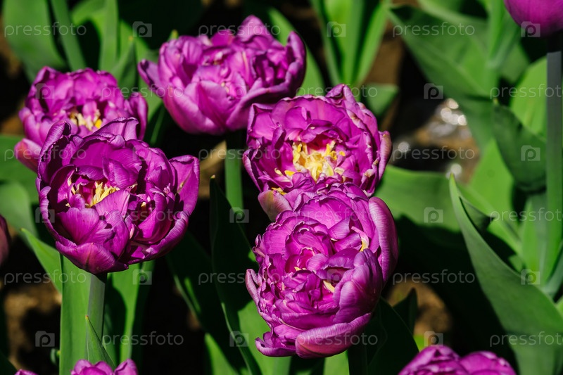 Естественный фон весенних цветущих цветов. Поле фиолетовых тюльпанов