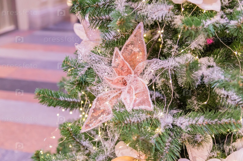 Рождественские и новогодние праздники фон. Елка украшена белыми шарами и нежными цветами. Концепция праздника