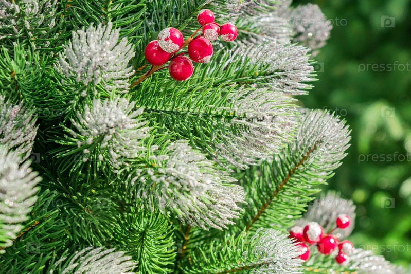 Рождественские и новогодние праздники фон. Новогодняя елка украшена искусственным снегом и гирляндами. Блестящие и сверкающие. Концепция праздника