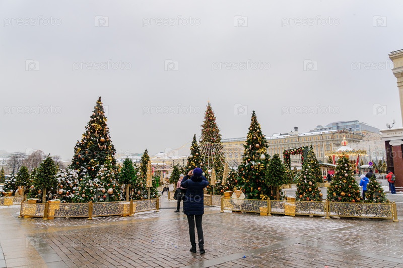 Москва, Россия - 20 декабря 2018 г.: Туристы фотографируют украшенную Рождеством Манежную площадь. Много новогодних елок на фоне Красной площади