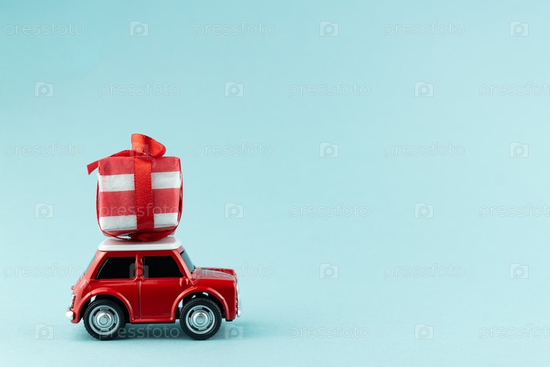 Красная игрушечная модель автомобиля с подарочной коробкой на синем фоне. Концепция доставки на Рождество и Новый год