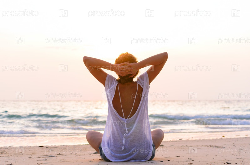 Сидя на пляже на восходе