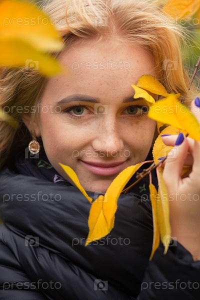 Довольно счастливая женщина с желтыми листьями улыбается