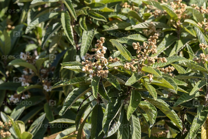 Цветящие ветви мушмулы (Eriobotrya japonica) в крупном плане