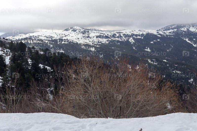 Сосновый лес в высокогорье (регион Эпир, Греция) в зимний снежный день