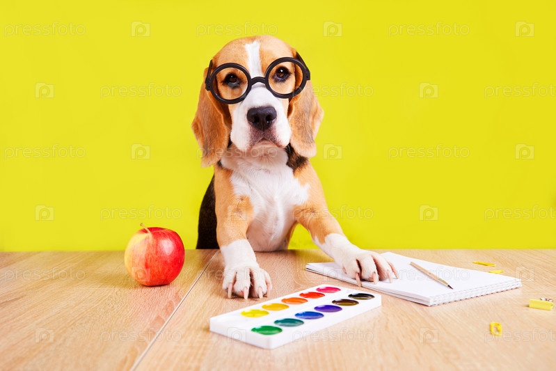 Собака-бигль в круглых очках сидит за столом с акварелью
