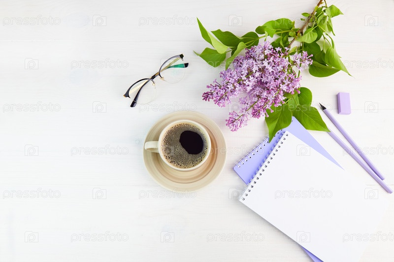 Ветка сирени, чашка кофе, очки, блокнот с ручкой