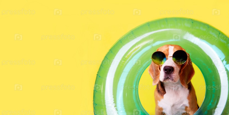 Собака-бигль в темных очках и надувном круге для плавания