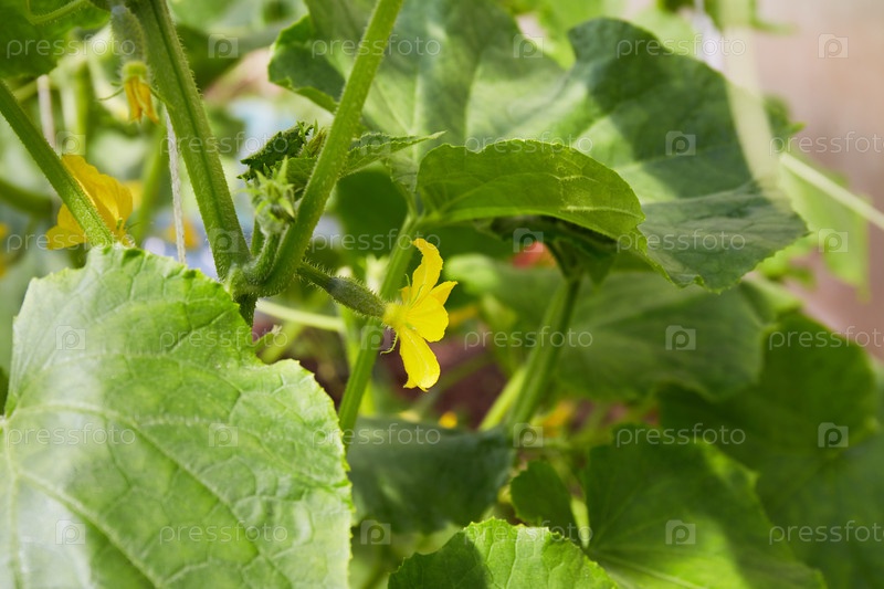 Молодые зеленые огурцы в теплице. Завязи молодых зеленых огурцов с цветком