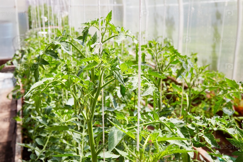 Молодые цветущие помидоры растут в теплице