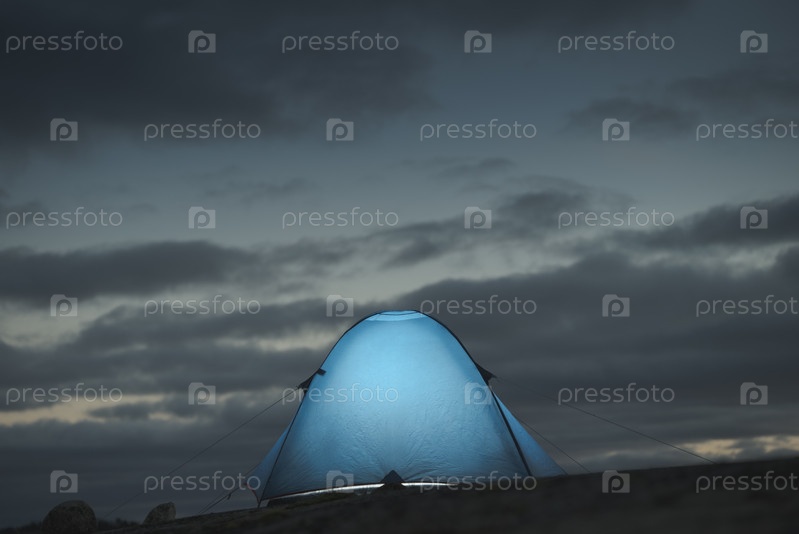 Освещенная палатка для кемпинга на фоне красивого неба