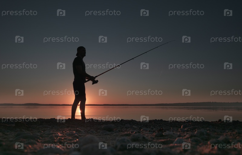 Мужчина с удочкой на берегу живописного озера рано утром