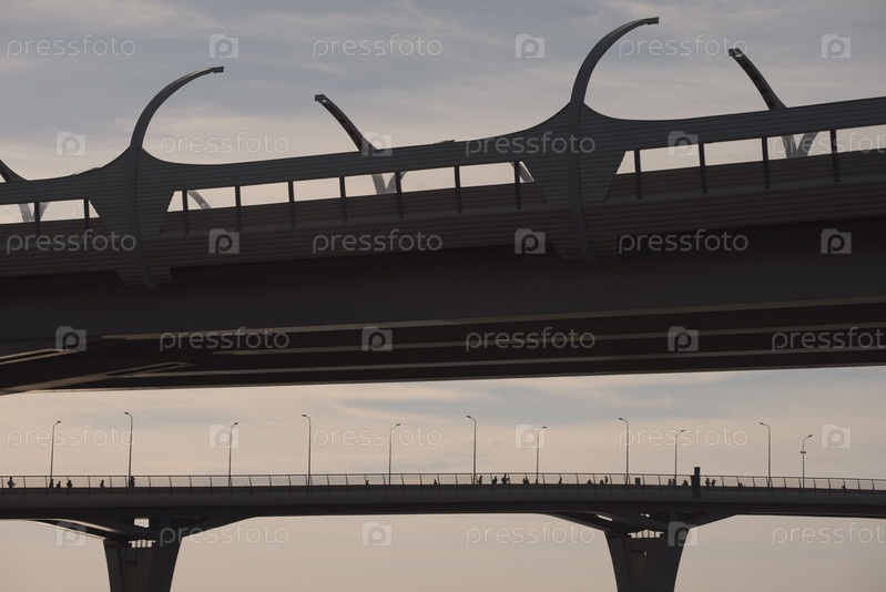 Силуэты пролетов моста. Два моста один над другим. Сложные инженерные сооружения