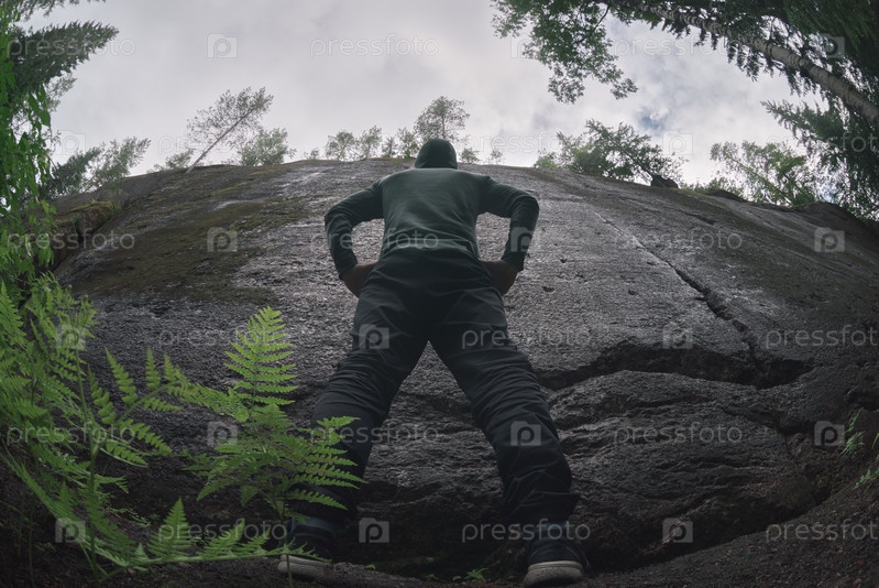 Человек стоит перед непреодолимой вертикальной гранитной стеной. низкий угол