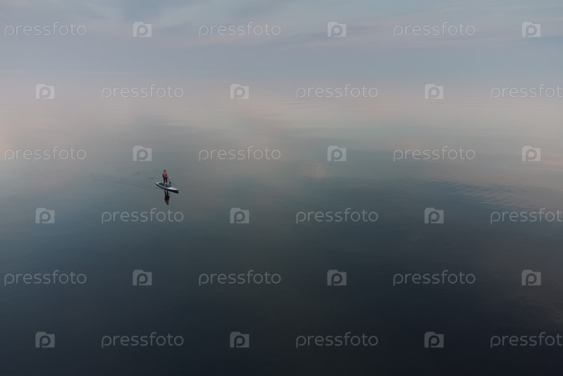 SUP-бординг в открытом море. Открытое спокойное море. Небо сливается с водой
