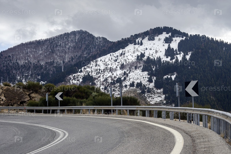 Зима в горах (район Эпира, Греция) и проселочная дорога в зимний день