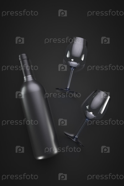 Бутылка вина и два бокала лежат на столе. Алкогольная тематика