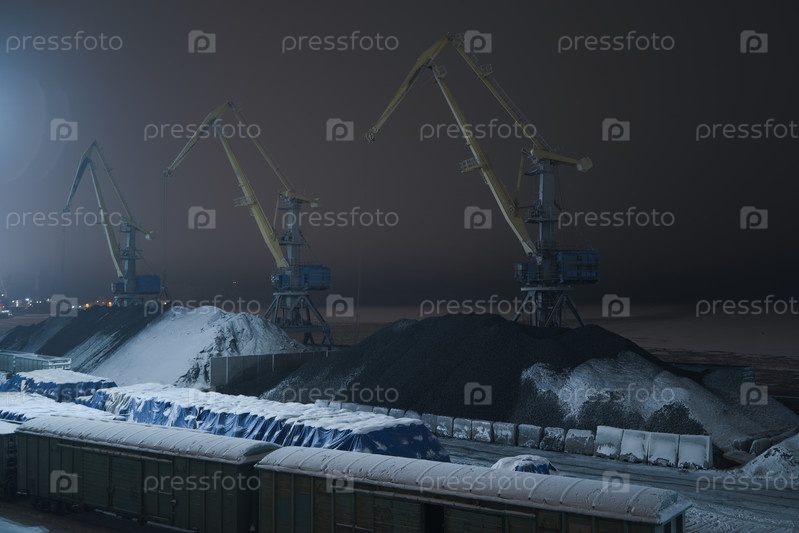 Кучи угля в портовом терминале. Тематика энергоносителей, логистики и поставок. Зимнее время