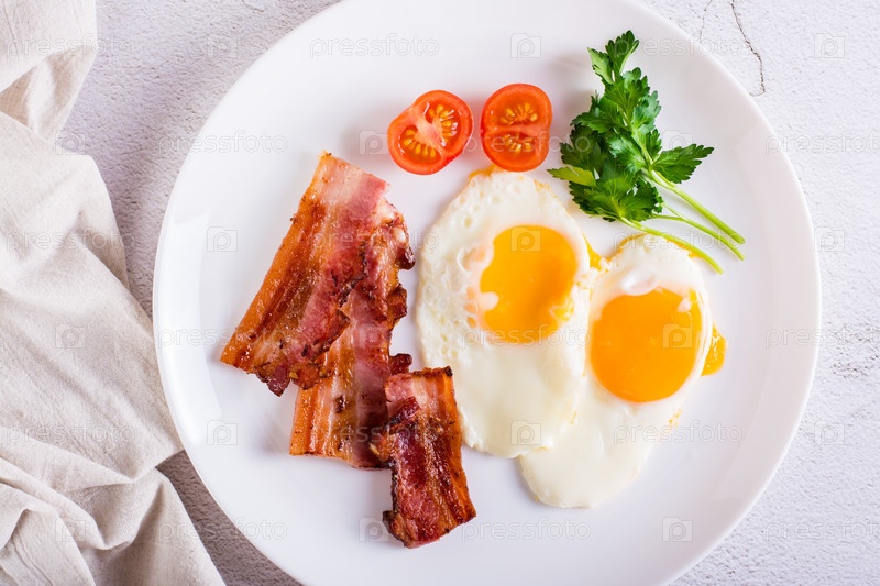 Жареные яйца и бекон, помидоры и петрушка на тарелке. Домашний завтрак. Вид сверху. Крупный план