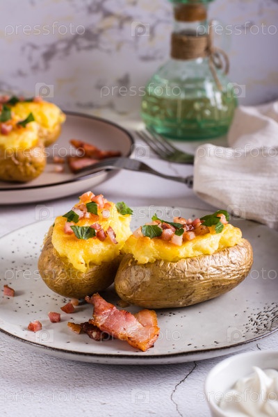 Дважды запеченный картофель с беконом и сыром на тарелке на столе. Домашний ужин. Вертикальный вид