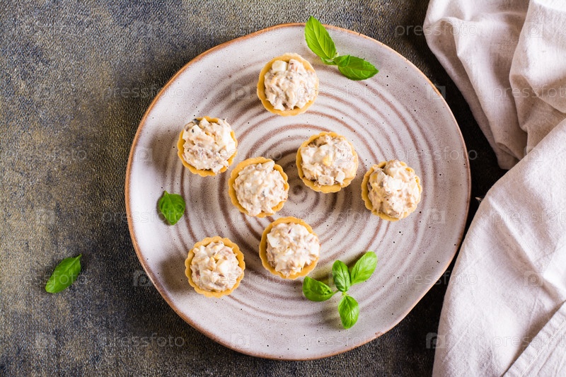 Тарталетки с салатом из консервированной рыбы, яйцами и майонезом на тарелке. Домашние закуски. Вид сверху. Крупный план
