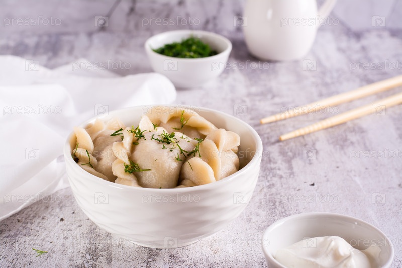Вареные пельмени в миске, сметана и зелень на столе. Домашняя еда