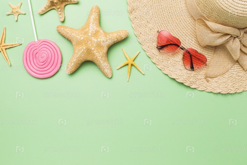 Пляжные аксессуары, декоративные морские звезды и леденец на зеленом фоне с копией пространства, летний фон