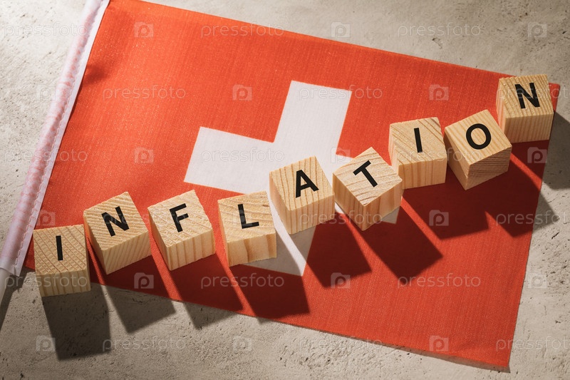 Флаг Швейцарии и деревянные кубики с текстом, концепция на тему инфляции в стране