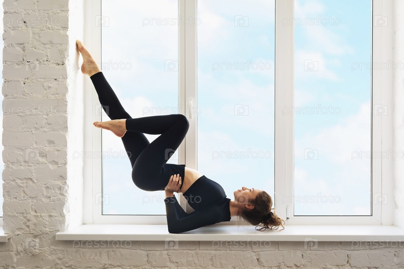 Молодая женщина в черной спортивной одежде выполняет вариант упражнения випарита карани мудра, тренируется на подоконнике с видом на облачное небо