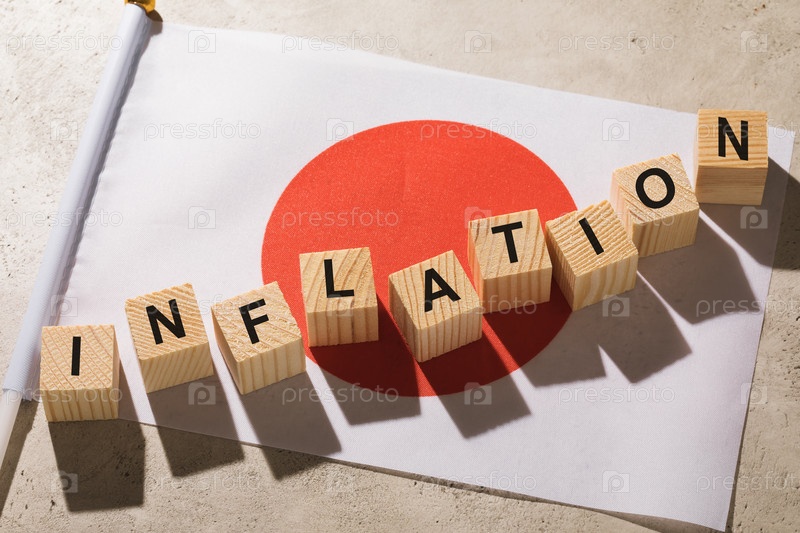 Японский флаг и деревянные кубики с текстом, концепция на тему инфляции в Японии