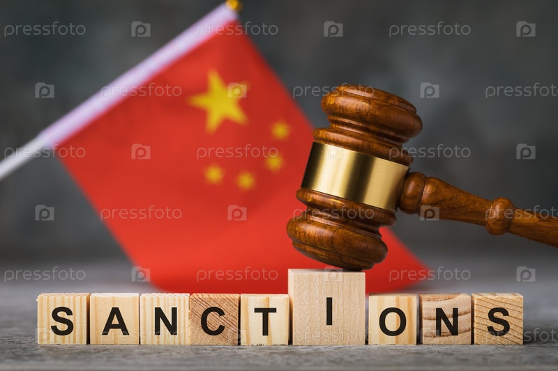 Деревянные кубики с текстом и молотком судьи на фоне китайского флага, концепция на тему санкций в Китае