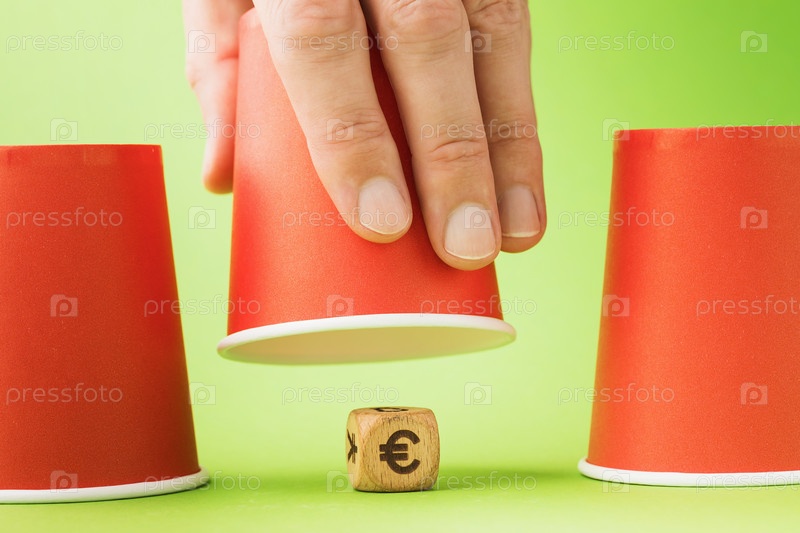 Приподнятое стекло и деревянный куб с символом евро под ним, концепция азартных игр наперстком и их вред